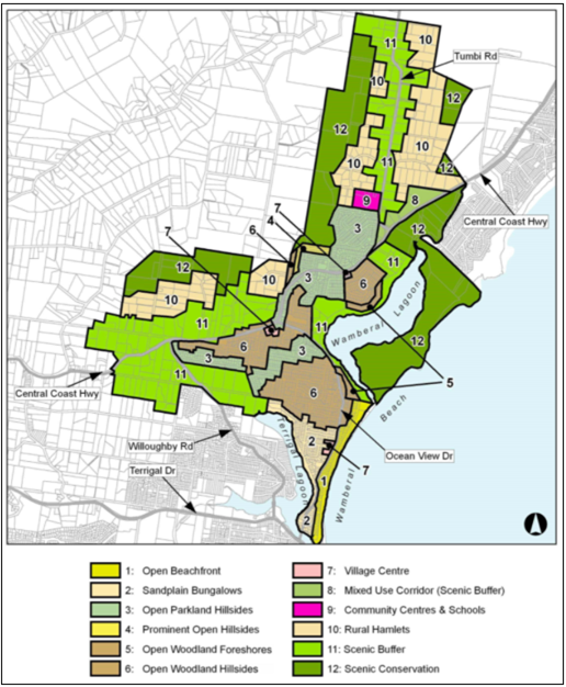The subject site is located within the Wamberal Character Precinct 6 – Open Woodland Hillsides –. The desired character statement for this locality (summarize) recommends that: