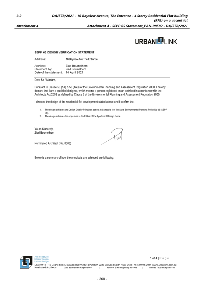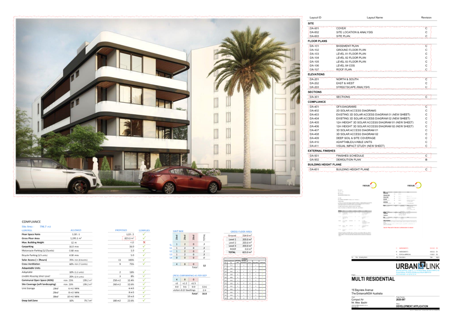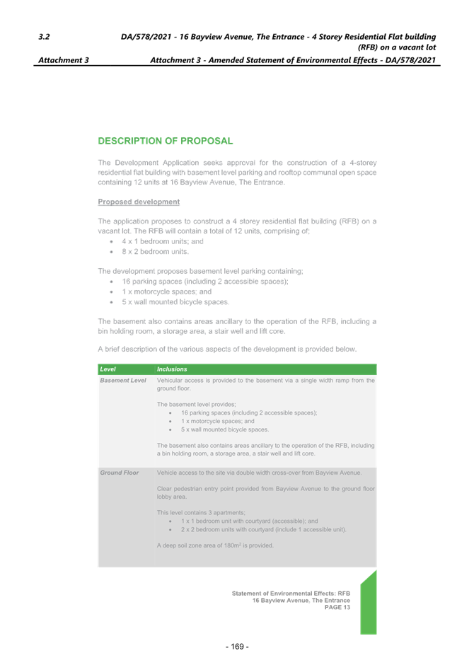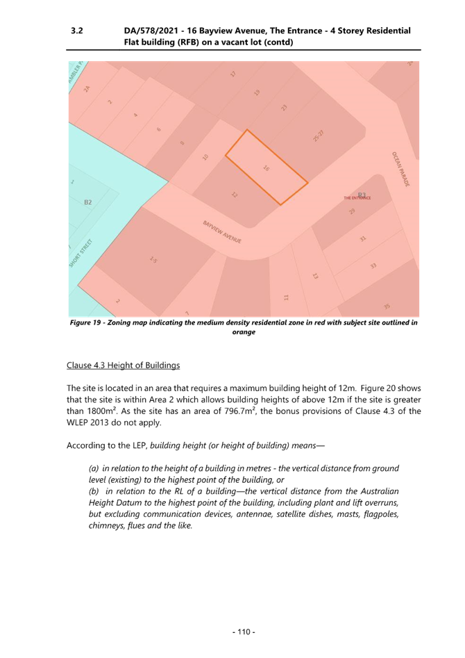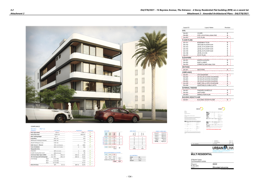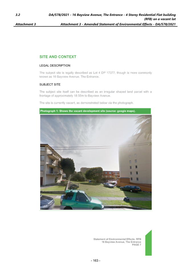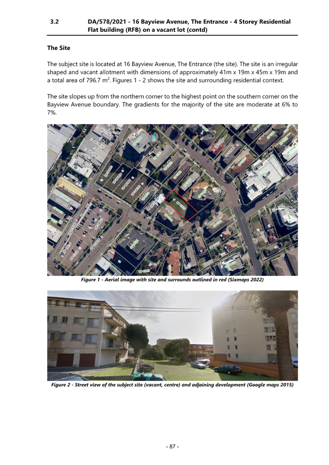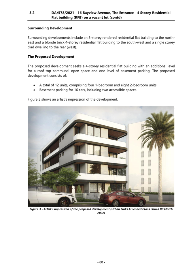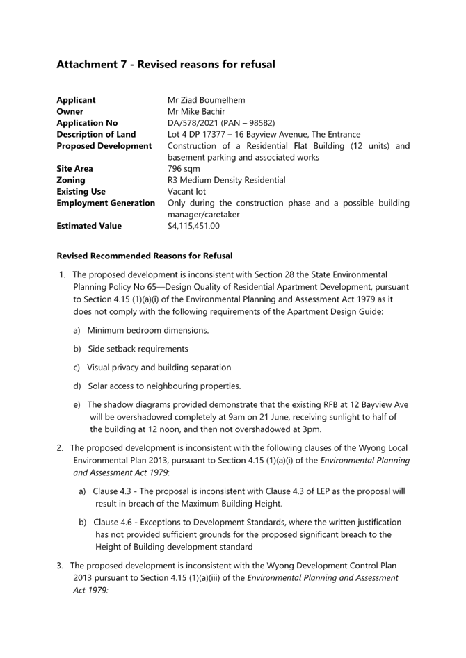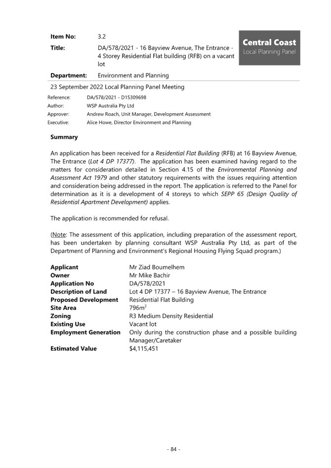 Applicant Mr Ziad Boumelhem Owner Mr Mike Bachir Application No DA/578/2021 (PAN – 98582) Description of Land Lot 4 DP 17377 – 16 Bayview Avenue, The Entrance Proposed Development Construction of a Residential Flat Building (12 units) and basement parking and associated works Site Area 796m2 Zoning R3 Medium Density Residential Existing Use Vacant lot Estimated Value $4,115,451.00