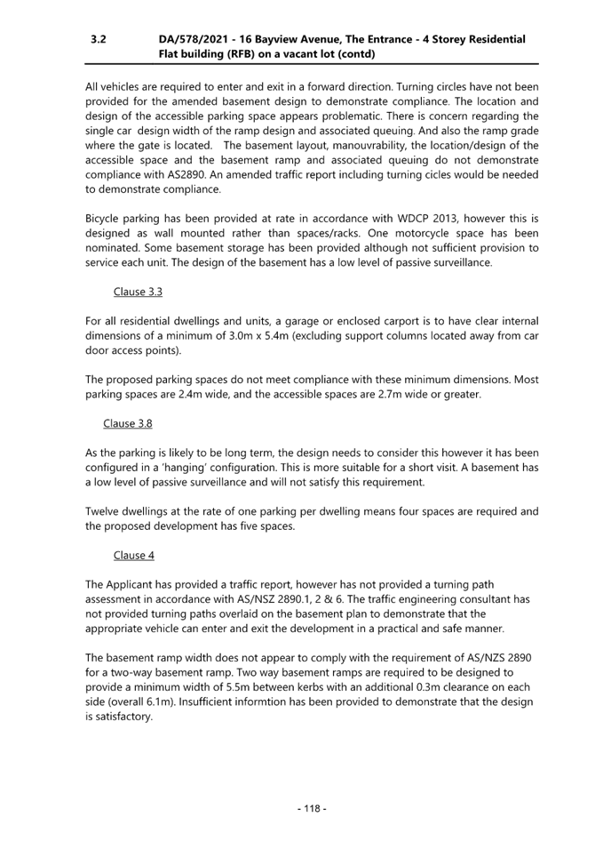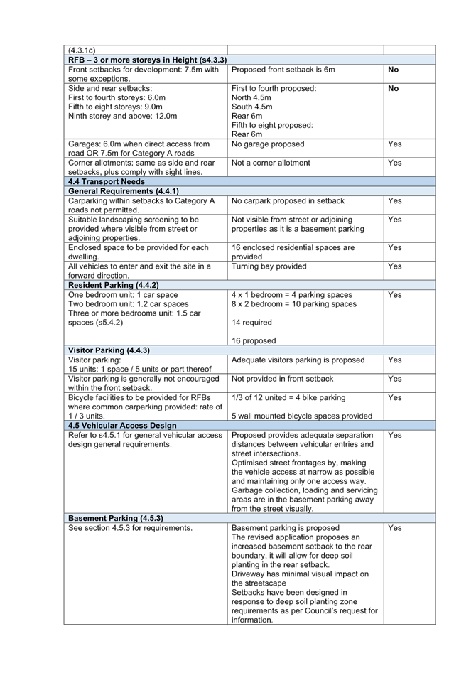 Section 3.3 - the proposed does not meet compliance with minimum carparking dimensions. Section 3.8 - the proposed basement provides a low level of passive surveillance. |