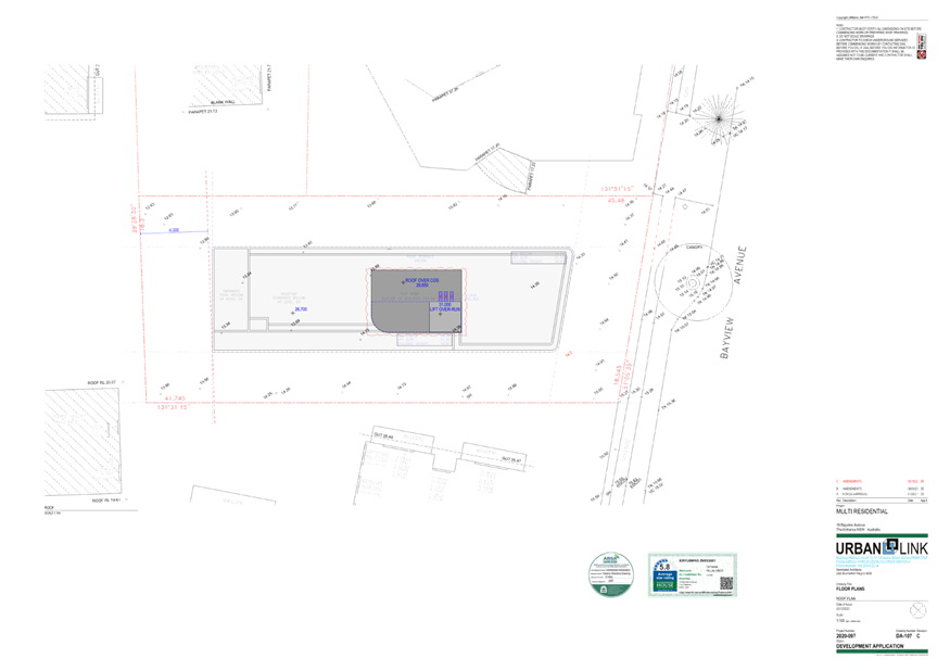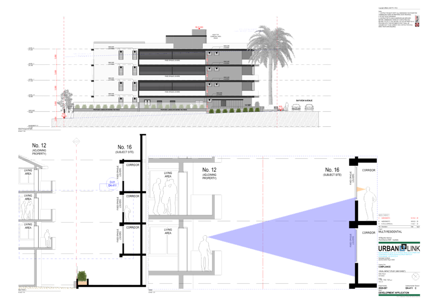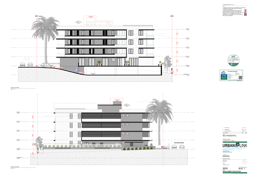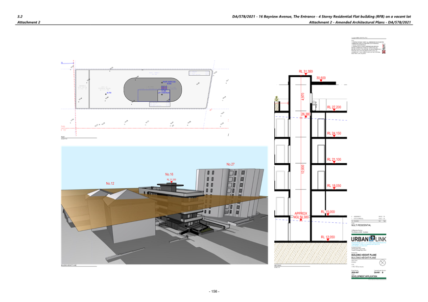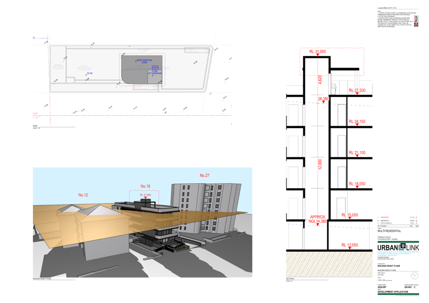 Note: Under amended plans there is no change to overall building height floor levels or to the main roof however, the lift overrun (which is the highest point) has been reduced from RL 31.350 to RL 31.000. This equates to a maximum height of 16.95m and a variation of 4.95m (41%) over the 12m control.