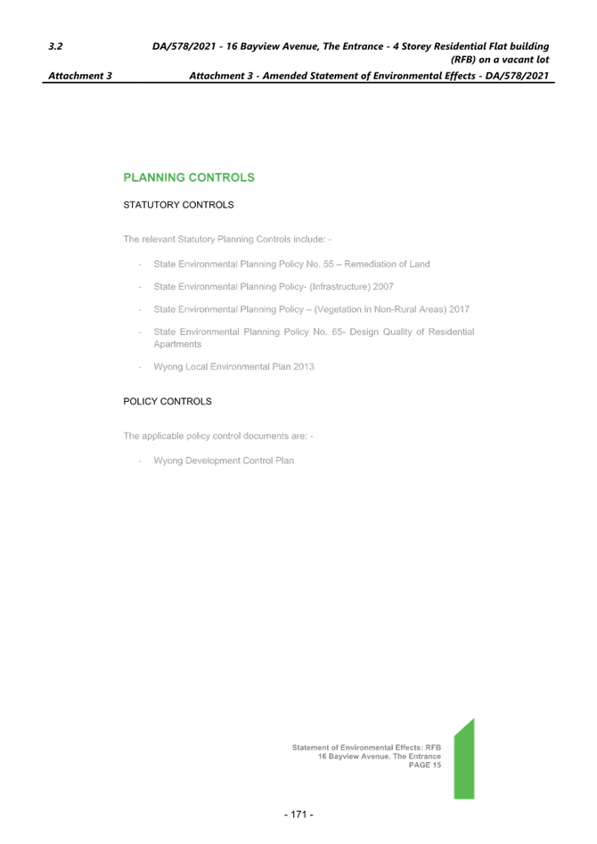 1. Environmental Planning and Assessment Act 1979 (EP&A Act 1997) 2. State Environmental Planning Policy (Biodiversity and Conservation) 2021 3. State Environmental Planning Policy (Building Sustainability Index: BASIX) 2004 4. State Environmental Planning Policy (Resilience and Hazards) 2021 5. State Environmental Planning Policy (Transport and Infrastructure) 2021 6. Wyong Local Environmental Plan 2013 (WLEP 2013) 7. Central Coast Local Environmental Plan 2022 (CCLEP 2022) 8. Wyong Development Control Plan 2013 (WDCP 2013) |