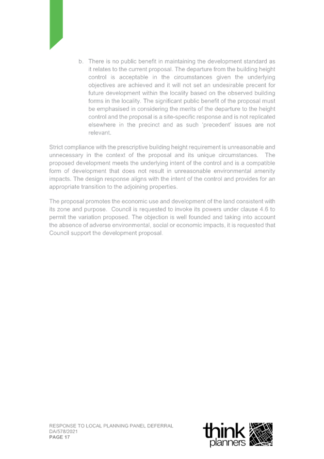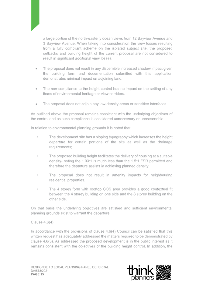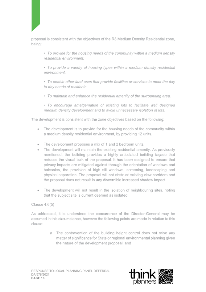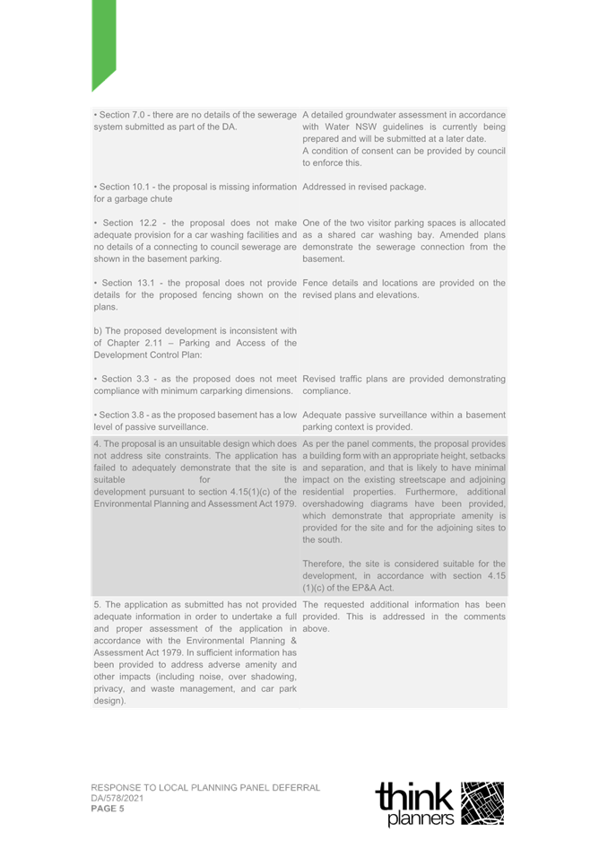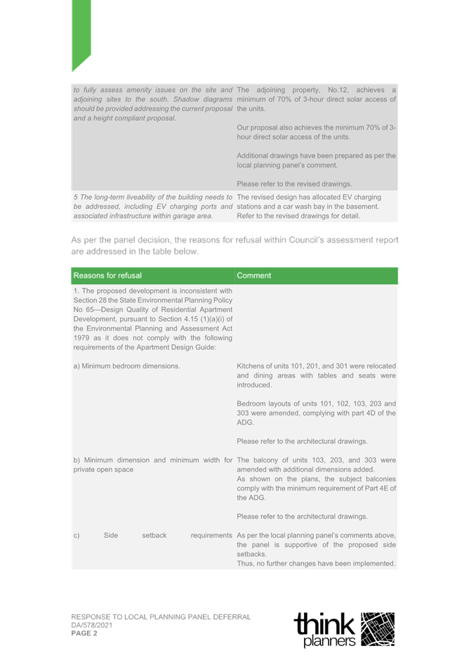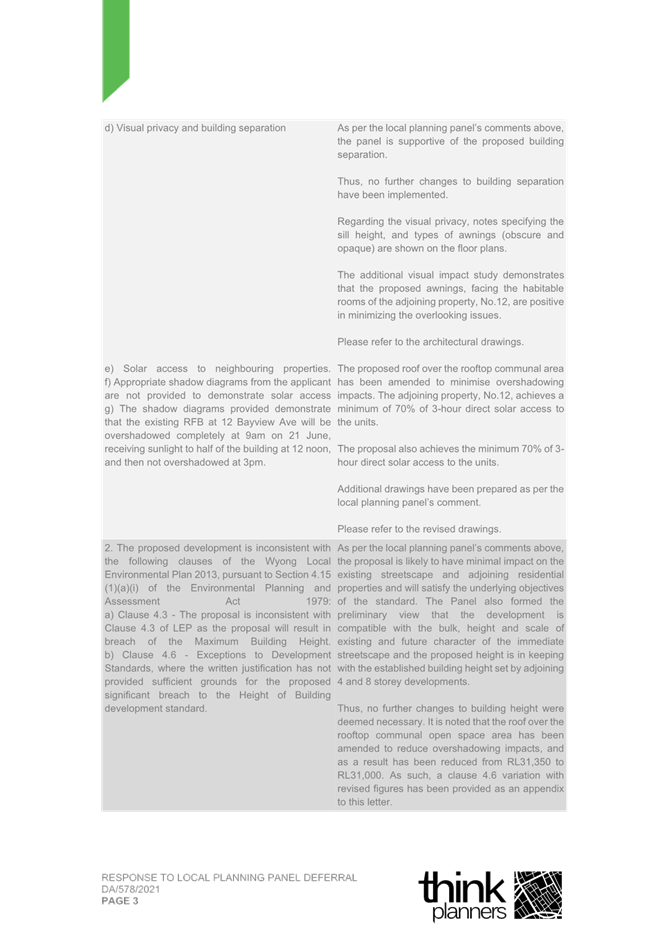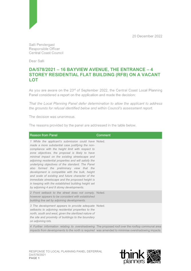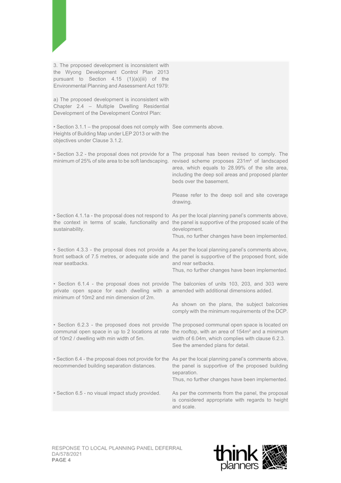 2. Response Letter to Panel Reasons for Decision and the Assessment Report Reasons for Refusal (prepared by Thynk Planners) and including a revised Clause 4.6.; and