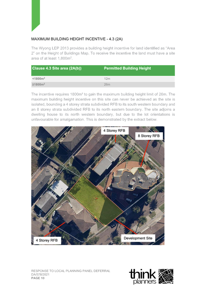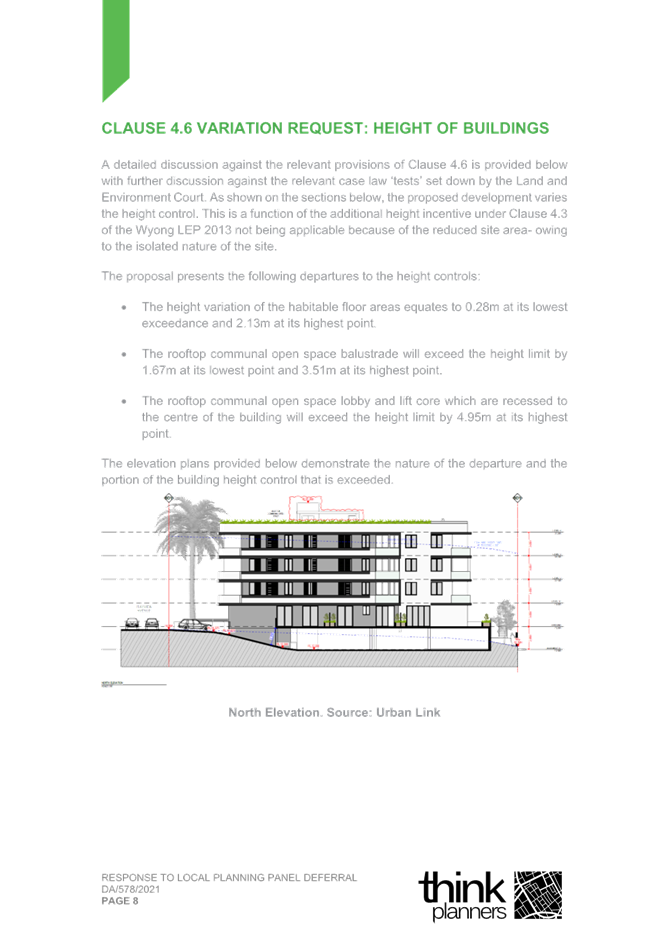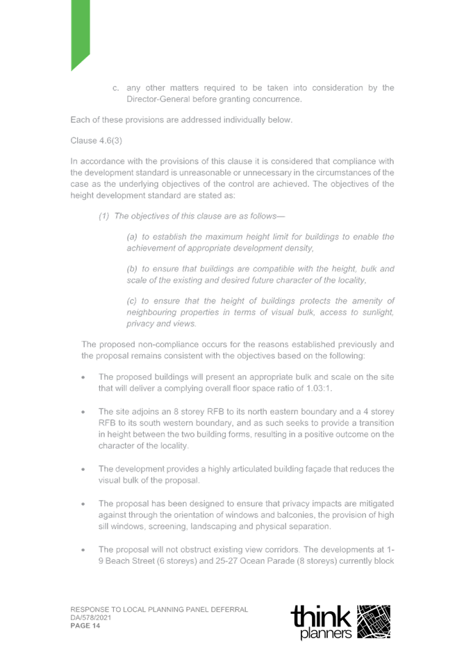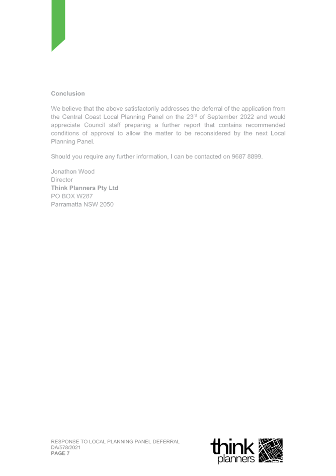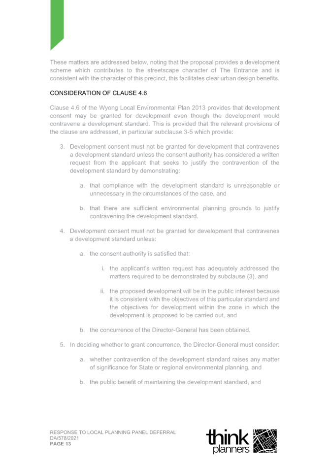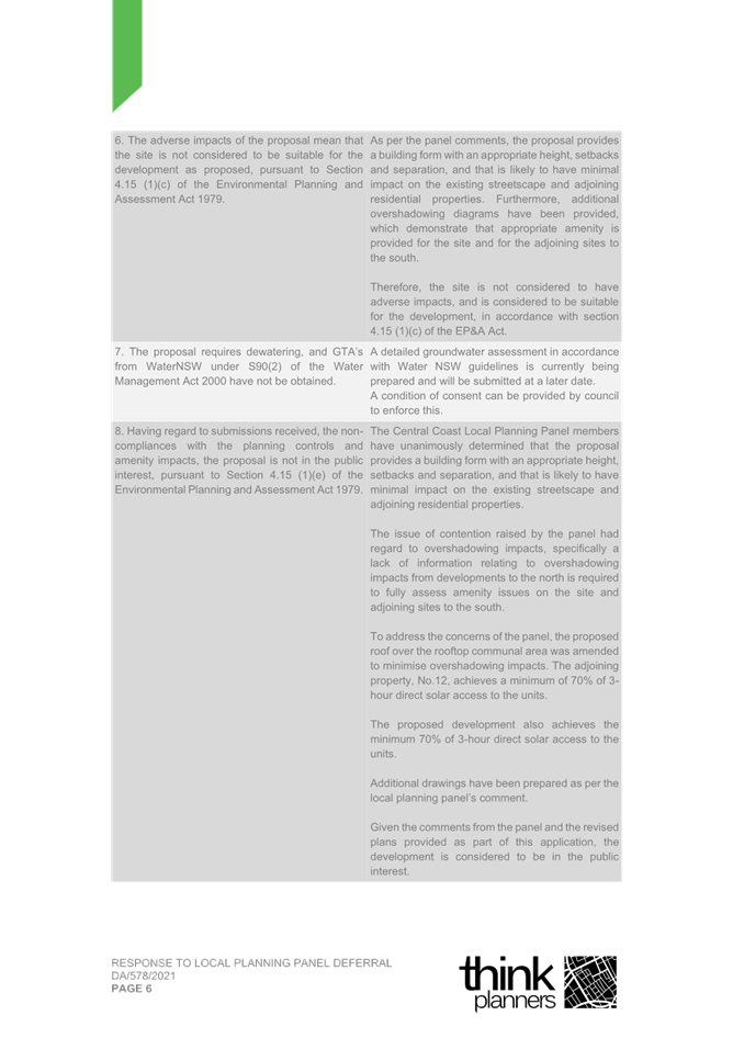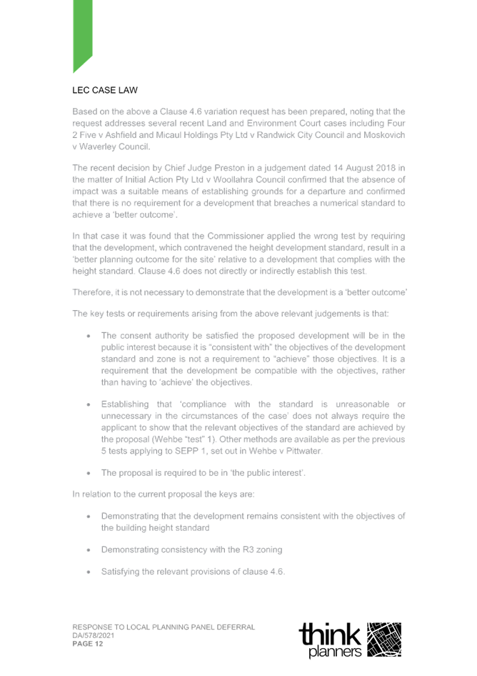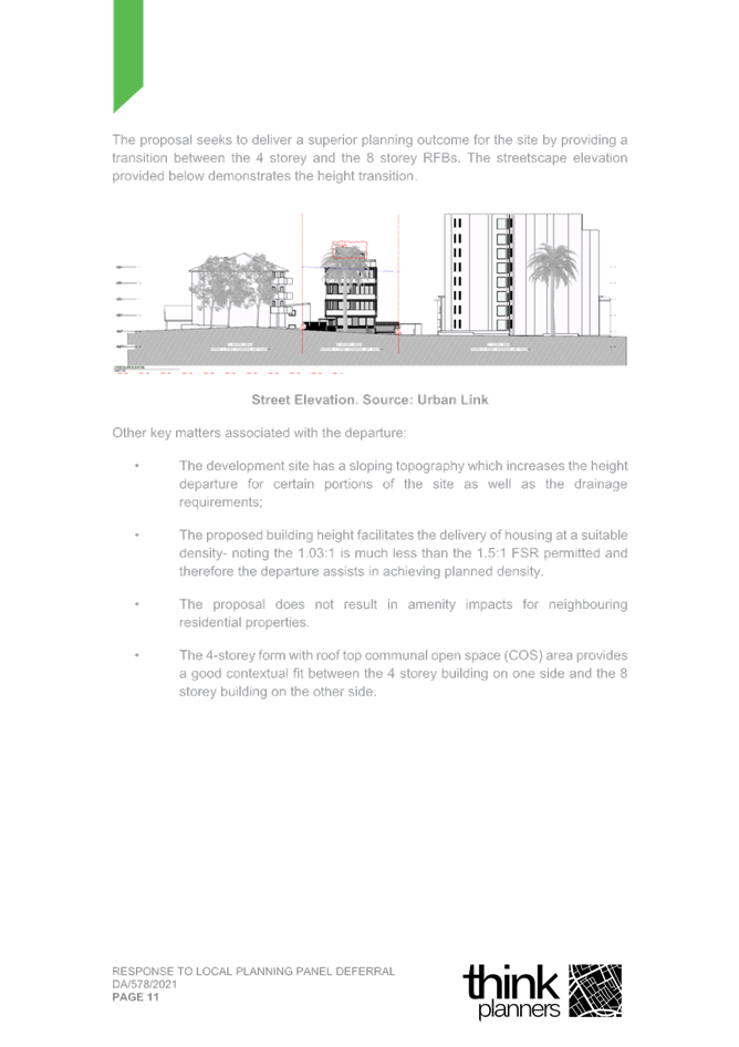 2. Response Letter to Panel Reasons for Decision and the Assessment Report Reasons for Refusal (prepared by Thynk Planners) and including a revised Clause 4.6.; and