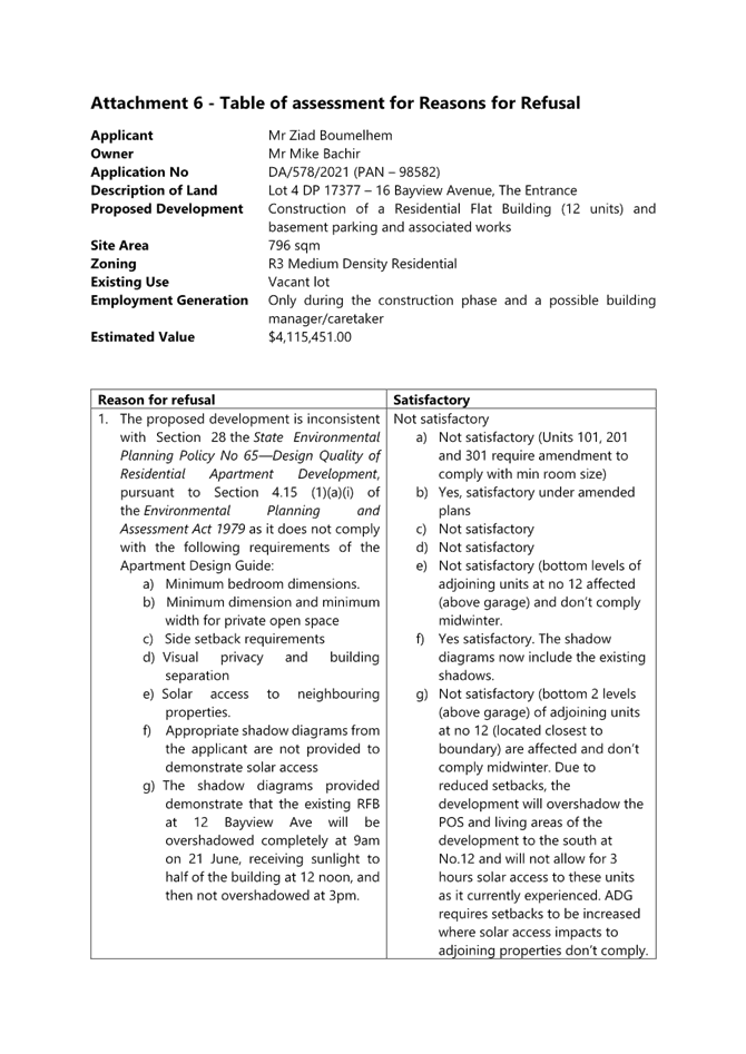 Table of assessment for Reasons for Refusal - 16 Bayview Ave The Entrance - DA/578/2021 |